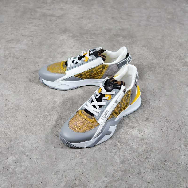 Sepatu Fendi dikenal karena desain ikonik yang mampu memikat perhatian dan menjadi ciri khas dari merek ini. Salah satu elemen yang paling terkenal adalah motif logo Fendi yang tersusun secara berulang, sering kali dijadikan aksen utama pada sep